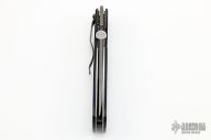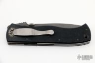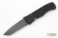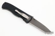 This 970S Emerson Designed CQC-7 by Benchmade features a bead blasted, chisel ground, drop point tanto style blade with swedge, thumb disc, notched thumb ramp and partial serrations. The handle is comprised of black G10 scales over titanium liners and black polymer backspacer. The steel pocket clip is positioned for tip down carry. Lanyard hole in pommel. Has some scuffs and scratches, otherwise good condition.
