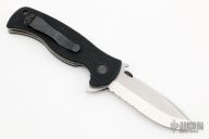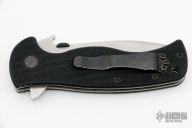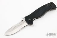 This Sheepdog from Emerson Knives features a partially serrated blade with stonewashed flats and satin grinds. Knife can be opened using the thumb disk, wave feature or flipper. The handle is comprised of black G10 scales over titanium lines with black barrel spacers and black stainless steel tip up pocket clip. Has some light scratches, has been resharpened, otherwise good condition.