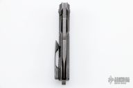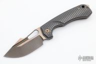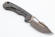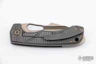 This Blood and Thunder V3 by Jason Stout features a bronzed milled bevel blade with fullers and thumbhole. The handle has a milled and tumble finished titanium frame with matching tip up pocket clip and a matching D2 backspacer. Nice detent, lockup and blade seating. Comes with a zippered case and COA dated Bladeshow 2022. Excellent condition.