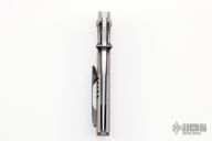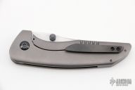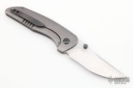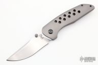 This Hokkaido by John Barker features a hand rub satin finished blade with notched thumbrest and dual zirconium thumbstuds. The handle has a bead blast finished titanium frame, Zirconium tip up clip and carboquartz backspacer. Rides on bearings, nice detent, lockup and blade seating. Comes with soft pouch. New from maker at the 2022 Nashville Custom Knife Show.