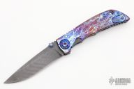 This Harsey framelock folder by Spartan Blades features a Damascus drop point blade with dual thumbstuds and a notched thumbrest. The handle has an anodized titanium frame and matching tip up titanium clip and filler tab. Has nice detent, lockup, and blade seating. Comes with original box. New from maker!