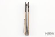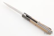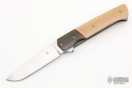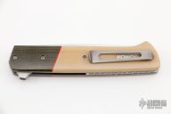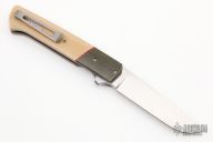 This Bobby Lowe by Jason Clark features a hand rub satin finished blade with a checkered thumbrest and flipper tab. The handle has green micarta dovetailed bolsters, bone linen micarta scales with a red spacer, blasted titanium liners with a titanium tip pocket clip and a stainless steel backspacer.  Nice detent, lockup and blade seating. Comes with a leather slip sheath and COA. New from maker.