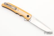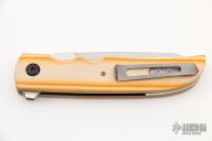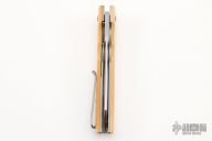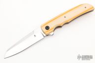 This Model 1 Hybrid by Jason Clark features a hand rub satin finished blade with a swedge and flipper tab. The handle has g-carta scales with blasted titanium liners with a titanium tip pocket clip and a floating stainless steel backspacer.  Nice detent, lockup and blade seating. Comes with a leather slip sheath and COA. New from maker.