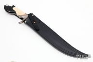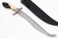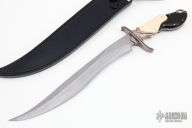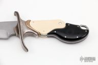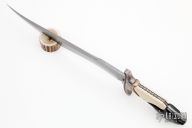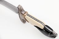 "Duality" by Anders Hogstrom. It features a long slender persian style 1050 carbon steel blade with false top edge and a beautiful hamon, .241" blade stock and 1.458" blade depth, hidden/frame tang construction. The handle has a cast sterling silver guard, bronze spacer, Damasteel frame, mammoth ivory and black G-10 scales, lanyard hole at the butt. The pins are sterling silver. Comes with a black leather sheath and a nylon velcro case. New from maker!