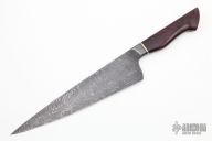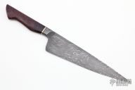 This Integral Chef's Knife by Andrew K Smith features a Damascus blade with a nice distal taper and integral guard, .125" blade stock and 2.105" blade depth, hidden tang construction. The handle has a dyed Bird's Eye Maple burl wood grip with a bronze spacer. Comes with a zippered case. New from maker at the 2022 NCKS.