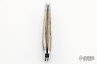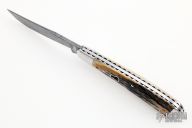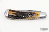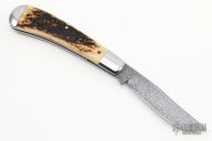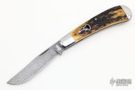 This Trapper by Chris Sharp features his Patented see-through escutcheon. The blade is Chris's own Damascus. The handle has polished 416ss fluted bolsters with integral liners and escutcheons, beautiful stag covers, filework on liners, stainless steel spring. Has half-stop, flush in all positions. Comes with zippered case.  New from maker at the 2022 NCKS.