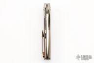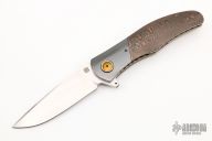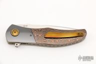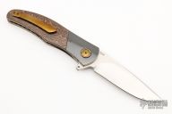 This HB13 linerlock flipper by Herucus Blomerus features a hand rubbed, satin finished blade with polished flats and flipper. The handle has zirconium bolsters with anodized titanium pivot collars, Gold Camo Fat Carbon scales with anodized titanium liners, notched Gold Camo Fat Carbon backspacer, and a tip up anodized titanium clip. Blade is centered when closed, nice detent and lockup. Very smooth flipping action, rides on Ceramic IKBS. Comes with nylon velcro case and COA. New from maker at the 2022 NCKS.