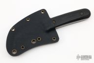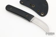 This knife by Rob Dalton features a bead blasted hawkbill blade with .130" blade stock and .778" blade depth, full tang construction. The handle has black G-10 scales. Comes with kydex sheath. Has a light sheath scuff, otherwise excellent condition. One off?