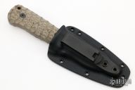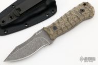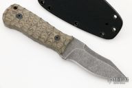 This Knife by Frank Landau III features an acid washed blade with false top edge and fileworked thumbrest, .143" blade stock and 1.113" blade depth, full tang construction. The handle has textured linen micarta scales with black screws. Comes with a C4 Industries kydex sheath with clip. New from maker at the 2022 NCKS. 1 of 2 in this size