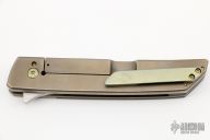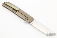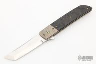 This Hamachi Framelock Flipper by Pohan Leu has a satin finished tanto blade with swedge and flipper. Handle is marble carbon fiber over an anodized and orange peel finished titanium frame, marble carbon fiber backspacer, orange peel finished and anodized titanium bolster and tip up clip. Dead center blade seating, perfect detent, and rock solid lockup, rides on IKBS. Beautifully made piece. Comes with zippered case. Excellent condition.