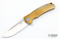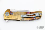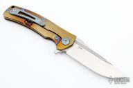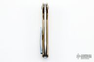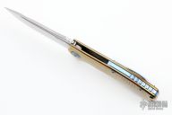 This Horizon from Reate Knives features a tumble finished blade with fuller, notched thumbrest and flipper. The handle has an anodized and milled titanium frame. Pivot and tip up pocket clip have been anodized for a faux mokuti appearance, all other hardware and backspacer have been anodized blue. Nice detent, lockup and blade seating. Comes with a zippered case. Excellent condition.