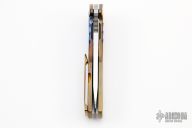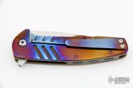 This Insight linerlock flipper by Dustin Turpin features a hand rub satin finished blade with notched thumbrest and flipper. The handle has an orange peel finished and anodized titanium frame and tip up pocket clip, tan G-10 and anodized titanium 3-piece backspacer with lanyard pin. Very nice work. Rides on bearings, strong lock up, nice detent and blade seating is dead center. Includes a padded zippered case. Has a couple very light scratches, otherwise excellent condition.