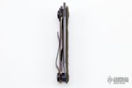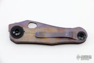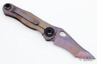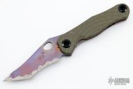 This Framelock folder by Warren Thomas features a fingerprint anodized titanium chisel ground blade that has a carbidized edge with thumbhole. The handle has a green G-10 and fingerprint anodized titanium frame and a tip up clip. Nice detent, lockup and blade seating. Has a couple light scuffs, otherwise excellent condition. Comes with a zippered case.