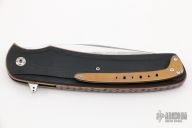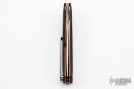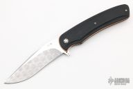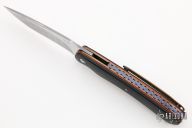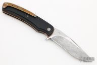 This Cruz Flipper by JD Van Deventer features a Damascus blade with mirror polished flats, false top edge and a flipper. The handle has black G-10 scales with orange G-10 liners, anodized titanium liners with fileworked spines, fileworked and anodized titanium backspacer, tip up anodized titanium clip. Nice detent, lockup and blade seating. Rides on IKBS. Comes with a zippered case. Has some light scratches, otherwise excellent condition.