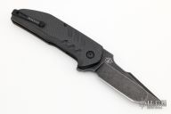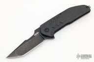 This Strife is a Dustin Turpin design executed by Jason Brous of Brous Blades. It features a black tumble finished clip point blade with swedge, notched thumbrest and flipper. The handle is comprised of machined carbon fiber scales over black tumbled titanium liners and black polymer backspacer. Stainless steel tip up clip and lanyard bail on pommel. Numbered 447/500 on flipper. Excellent condition.
