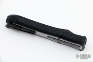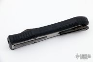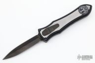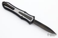 This knife is a Deadlock Model C by Grant and Gavin Hawk. It has a double-edged black blade. The handle has a black aluminum frame with stonewashed titanium overlays, a tip down spring clip, titanium. The thumb slide on the handle is also titanium and handle has titanium overlays. Comes with a cloth pouch. Grant and Gavin Hawk set out to create a double action OTF with no blade play.... They did it, NO blade play. Comes with tool and cloth case. Excellent condition.