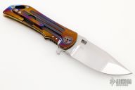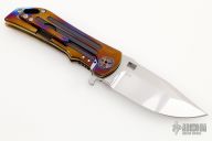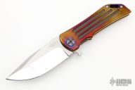 This Dominator by Darrel Ralph features a mirror finished, compound ground clip point blade with swedge, notched thumb ramp and flipper. The handle has an anodized titanium frame with matching tip up clip over a titanium back spacer. Lanyard hole in pommel. Has some light scratches, otherwise excellent condition.