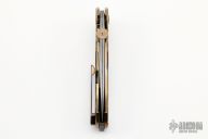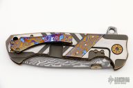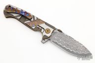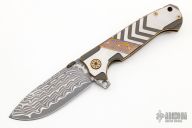 This ADV Trailboss framelock flipper has a San Mai Damascus drop point blade with notched flipper and thumbdisc and thumbrest. Handle has a satin and bead blast finished titanium frame with mokuti inlays and tip up clip, two-tone titanium backspace with mokuti inlay. Frame has V-milling for added grip and visual appeal. Has stainless steel lockbar insert and lockbar stabilizer. Nice smooth action, detent, lockup and blade seating. Comes with a zippered case. Excellent condition. Dated 2015