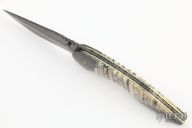 "All my life I have been a maker of many things, a jack-of-all-trades if you will. The idea of making a knife had been with me for a long time. Ever since I was a small boy I have always carried a knife, to me it was an Indispensable tool, never to be without. Later on in years, it was a good friend & hunting partner who finally got me started in knife making, though he was unaware of it. Every time we went hunting he would tell anyone who would listen about his knife, an old Rudy Ruana. The knife I carried at that time was nothing special, so one day after hearing one of his stories for umpteenth time I decided to make a knife of my own. I was going to apply all my crafting skills to this task. Little did I know that what I was plunging into was first going to evolve from a hobby, to an obsession, to something that would become my livelihood. That first knife was made from scavenged materials. A chainsaw bar for the blade, a copper electrode was made into the guard, the handle cut from an old rosewood picture frame. It took months of trial and error to finish that knife, but Upon completion of the first, I felt challenged to make another, but better. This is and always will be my creed. I promise to deliver each knife better than the last. That is the true challenge of what drives me today, to deliver the best I can. So I will go any length to ensure satisfaction and deliver what is truly a hand crafted knife. My choice of materials for my knives are natural and exotic handle materials such as pearl, bone, ivory or fine burlwood combined with a Damascus blade. All my knives are made by stock-removal, free hand ground and hand finished. I do not work off of set patterns, but from a simple drawing. This takes a little more time but it also allows me to be more creative and have full control to make slight changes to each custom knife, obviously as result no two knives are ever identical. My first knife was it was once described by another knife maker as organic in design. My basic designs still reflect that organic flow, graceful curves and a minimum of straight lines. I maintain sole authorship on all my knives with the exception of the Damascus I use and heat-treating of stainless steels. Like many makers I began with fixed blades, as I gained skills I moved into folders, then autos. Lately I have taken to building my folders with all the screws hidden."