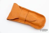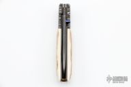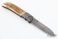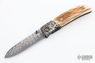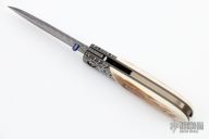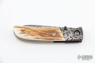 This Dressed TTF-6 by Bob Terzuola features a Damascus blade with single thumbstud and a notched thumbrest. The handle has Damascus bolsters, mammoth ivory scales, anodized titanium liners, anodized titanium backspacer. Nice detent, lockup and blade seating. Comes with leather pouch. Excellent condition.