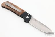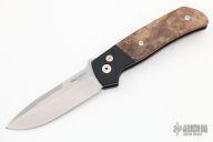 This ATCF Auto by Pro-Tech features a stonewashed Magnacut blade with notched thumbrest. The handle has a black aluminum frame with maple burl scales, tip up 3d milled titanium clip with hidden screws. Comes with original box and papers. New condition.