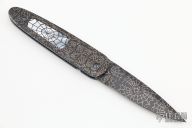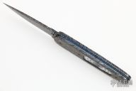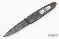 This knife by Rick Dunkerley features a mosaic Damascus blade with single thumbstud with a diamond set in a gold bezel. The handle mosaic Damascus scales with mother of pearl inlays, fileworked and colored stainless steel liners and a black fileworked steel backspacer. Nice lockup and blade seating. Comes with a felt case. Excellent condition.