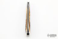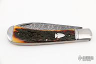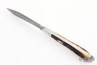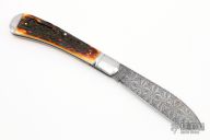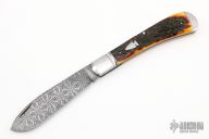 This slipjoint by Tanner Couch features a Bill Poor Gorgon Flower pattern Damascus blade with nail nick. The handle has threaded and fluted stainless steel bolsters, stag covers with a stainless steel arrowhead escutcheon, stainless steel liners and spring. Has half-stop, flush in all positions. Comes with a zippered case and COA. New from maker.