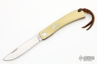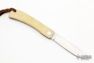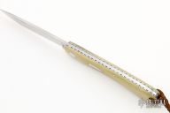 This Sod Buster by Tobin Hill features a hand rub satin finished blade with a nail nick. The handle has vintage bone linen micarta covers with a stainless steel escutcheon, stainless steel liners with fileworked spines, stainless steel spring. Has half-stop, flush in all positions. Includes a padded zippered case. New from maker.