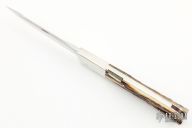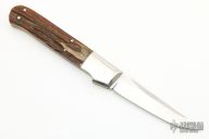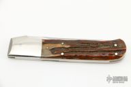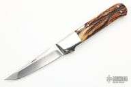 This Mid-Lock by W.D. Pease features a hand rub satin finished blade with nail nick. The handle has dovetailed nickel silver bolsters, stag scales, stainless steel backspacer, nickel silver liners and lock tab. Has a few light scratches, otherwise excellent condition.
