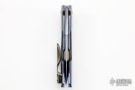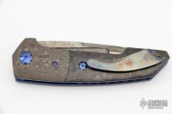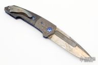 This Ottoman E-Lock folder by Allen Elishewitz features an Antique finished blade with milled fullers. The handle has antique finished and dovetailed mokuti bolsters, Damascus rocker bar, sparkle carbon fiber scales, anodized titanium liners, antique finished titanium clip. Excellent condition.