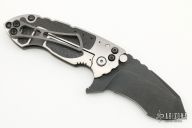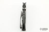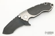 This Solo V5 Flipper by Direware Custom Knives features a black finish blade with swedge, notched thumbrest and flipper. The handle is comprised of a satin finish titanium frame with carbon fiber inlays, and a matching tip up clip. Includes a zippered case. Has some scuffs and scratches, good user condition.