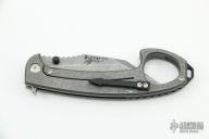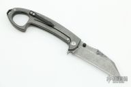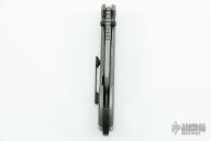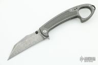 This SHPOS Framelock flipper by Half Face Blades features a stonewashed S45VN blade with notched thumbrest and flipper, dual thumbstuds. The handle has a stonewashed and milled titanium frame with black titanium backspacer and tip up clip that is reversible. Has a couple light scuffs, otherwise excellent condition.