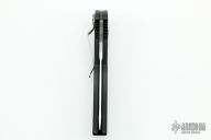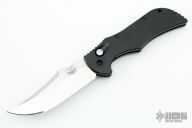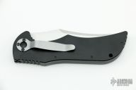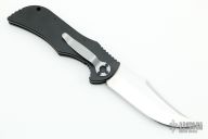 This Apex auto has a satin finished blade with notched thumbrest and false top edge. Handle is black anodized aluminum with a push button, tip down stainless steel clip. Has some light scuffs, has been resharpened, otherwise good condition.