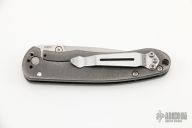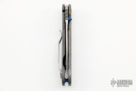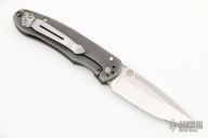 This Alias II by Bradley Cutlery Company features a tumble finished drop point blade with swedge, notched thumb rest and single blue anodized thumb stud. The handle is comprised of a bead blasted titanium frame over blue anodized barrel spacers. Lanyard hole in pommel. Tip Up/Down Reversible stainless steel clip. Great blade seating, detent and lock up. Has some light scuffs, otherwise excellent condition.