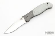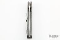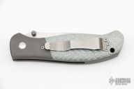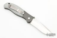 This linerlock folder features a hand-rubbed satin finish recurve blade with a notched thumb ramp and dual thumb studs.  The handle features bead blasted titanium bolsters/liners, silver twill carbon fiber scales and a tip up stainless steel pocket clip.  Light scuffs are visible on the frame otherwise the knife is in excellent condition.