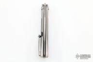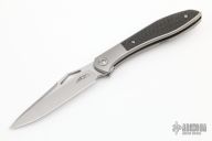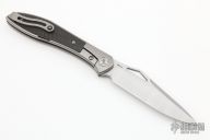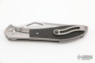 The Mongoose front flipper was designed by Jerry Moen and produced by Reate. This knife features a satin finished blade with a thumbhole and notched thumbrest.  The handle features a titanium frame, backspacer, and tip up pocket clip all complimented by carbon fiber inlays.  New condition.