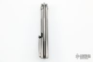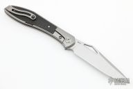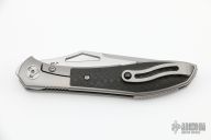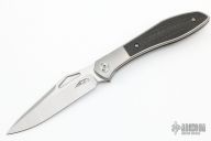 The Mongoose front flipper was designed by Jerry Moen and produced by Reate. This knife features a satin finished blade with a thumbhole and notched thumbrest.  The handle features a titanium frame, backspacer, and tip up pocket clip all complimented by carbon fiber inlays.  New condition.