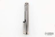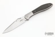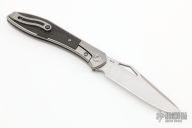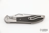 The Mongoose front flipper was designed by Jerry Moen and produced by Reate. This knife features a satin finished blade with a thumbhole and notched thumbrest.  The handle features a titanium frame, backspacer, and tip up pocket clip all complimented by carbon fiber inlays.  New condition.
