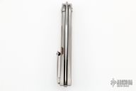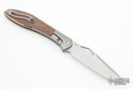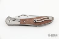 The Mongoose front flipper was designed by Jerry Moen and produced by Reate. This knife features a satin finished blade with a thumbhole and notched thumbrest.  The handle features a titanium frame, backspacer, and tip up pocket clip all complimented by canvas micarta inlays.  New condition.