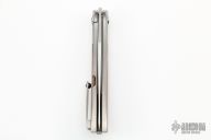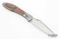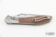 The Mongoose front flipper was designed by Jerry Moen and produced by Reate. This knife features a satin finished blade with a thumbhole and notched thumbrest.  The handle features a titanium frame, backspacer, and tip up pocket clip all complimented by canvas micarta inlays.  New condition.