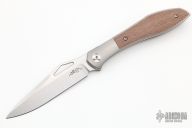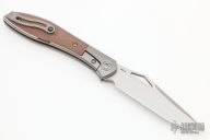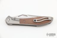 The Mongoose front flipper was designed by Jerry Moen and produced by Reate. This knife features a satin finished blade with a thumbhole and notched thumbrest.  The handle features a titanium frame, backspacer, and tip up pocket clip all complimented by canvas micarta inlays.  New condition.