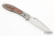 The Mongoose front flipper was designed by Jerry Moen and produced by Reate. This knife features a satin finished blade with a thumbhole and notched thumbrest.  The handle features a titanium frame, backspacer, and tip up pocket clip all complimented by canvas micarta inlays.  New condition.