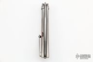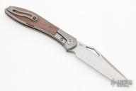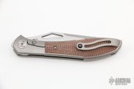 The Mongoose front flipper was designed by Jerry Moen and produced by Reate. This knife features a satin finished blade with a thumbhole and notched thumbrest.  The handle features a titanium frame, backspacer, and tip up pocket clip all complimented by canvas micarta inlays.  New condition.