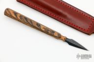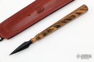 The Attention Getter by Neal Green features a black double edged blade with .472" blade depth, hidden tang construction. The handle has Bocote wood hexagonal grip. Comes with a brown leather sheath with red stitching. Includes original box and papers. New from maker at the 2022 NCKS.