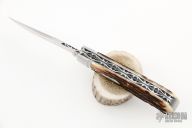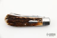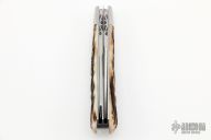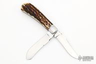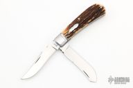 This 2-Blade Trapper by Jim Dunlap features hand rub satin finished blades with nail nicks. The handle has fluted stainless steel bolsters, stag covers, stainless steel liners, escutcheon and springs. Half-stop is flush in all positions. The liners, springs and blade spines have filework. Includes padded zippered case and COA. New from maker at the 2022 NCKS.