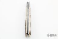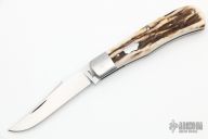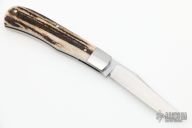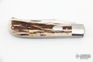 This Front Pocket by Jim Dunlap features a hand rub satin finished blade with nail nick. The handle has stainless steel bolsters, stag covers, stainless steel liners, escutcheon and spring. Half-stop is flush in all positions. Includes padded zippered case and COA. New from maker at the 2022 NCKS.
