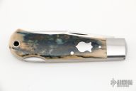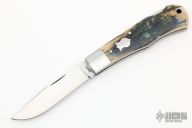 This 4" 1306 Remington Lockback by Jim Dunlap features a hand rub satin finished blade with nail nick and notched thumbrest. The handle has pinched stainless steel bolsters, mammoth ivory covers, stainless steel liners and spring. Includes padded zippered case. New from maker at the 2022 NCKS.