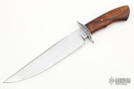 This knife by Journeyman Smith Wes Barnhill features a hand rub satin finished blade with nice hamon and false top edge, .238" blade stock and 1.611" blade depth, hidden tang construction. The handle has an engraved stainless steel guard, curly koa wood grip with a single domed nickel silver pin. Comes with a zippered case. Has a few light scratches, otherwise excellent condition.