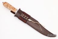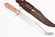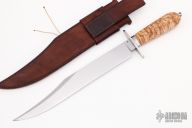 This Fighting Bowie by Journeyman Smith Stuart Smith features a hand rub satin finished blade with a sharpened top edge, .303" blade stock and 1.675" blade depth, hidden tang construction. The handle has a stainless steel guard and butt, wood grip, fluted stainless steel spacer. Comes with a brown leather sheath with ostrich leg skin overlay, has a cowhide corset style frog. Excellent condition.