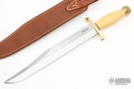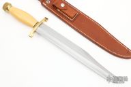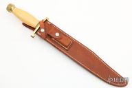 The 13" Randall Thorp Bowie by Randall Made Knives is similar to types used by Confederate troops. This one has an 13" carbon steel blade with sharpened top edge, .224" blade stock and 1.664" blade depth, hidden tang construction. The handle has a brass lugged guard and butt cap, and a yellow Westinghouse paper micarta grip with black spacers. Comes with a brown leather sheath. Excellent condition.